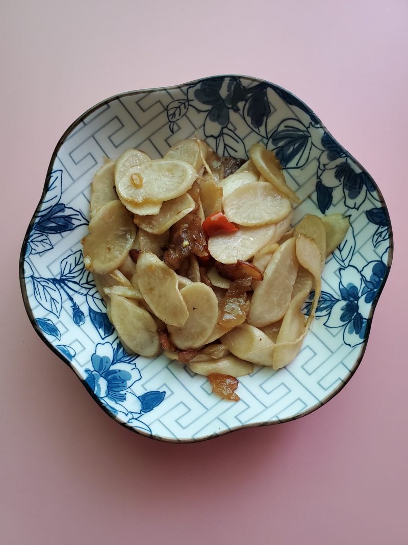 白萝卜半个;香肠50克;干红辣椒1个;鸡精1茶勺;生抽半茶勺;水淀粉适量;