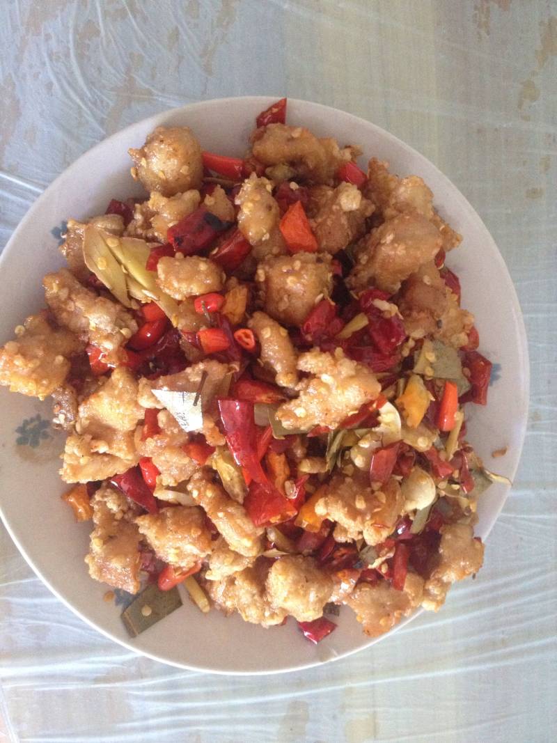 4:锅底放入少许油,把花椒,辣椒姜蒜末等爆香,加入鸡肉一起炒至辣椒变色即可。