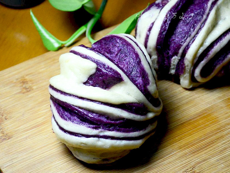 因紫薯面团没有白面团发酵的效果好,所以等量的面团,紫薯面团中多加了1克的酵母粉。