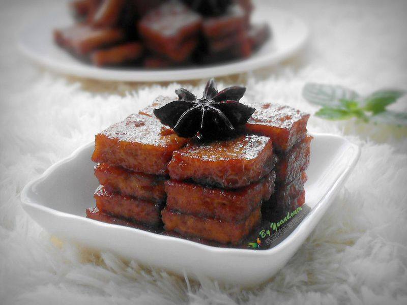 喜欢吃甜食的,可以在出锅后放点浓蜂蜜水。我觉得油豆腐比香干做出来的豆腐干要好吃,汁水多不干涩。