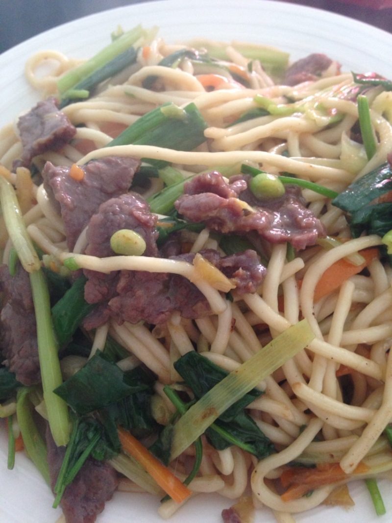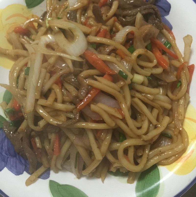 1:炒面一定要买这种圆的面条,先放在水里面煮5分钟,不能煮太烂,否则就没有嚼劲了。然后将面条放到凉开水中过凉,再加入油拌匀,这样就不会粘在一起