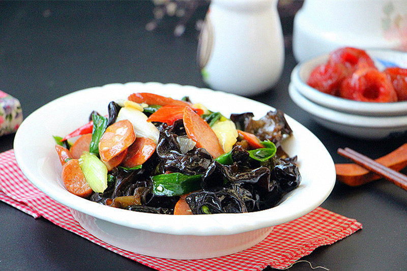 6:炒至青蒜,尖椒等稍稍断生,放入焯过水的木耳。