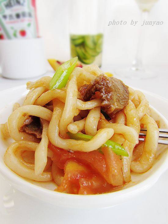 5:将切好的熟牛肉一起放去,翻炒至西红柿变软出汤汁