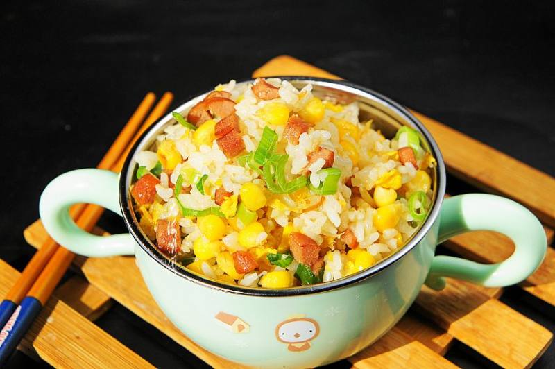 1:熟玉米去掉玉米须取粒,洗净,黑椒牛肉肠洗净切丁,小葱去皮洗净切碎,剩米饭根据人数确定用量。