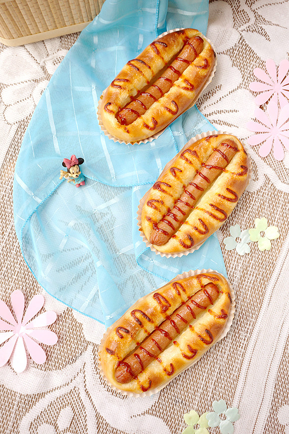 1:用料:高筋粉140克,鸡蛋25克,白砂糖10克,炼乳15克,盐1.5克,酵母2.5克,纯牛奶70克,黄油12克,牛肉热狗肠3根,番茄沙司适量,沙拉酱适量。