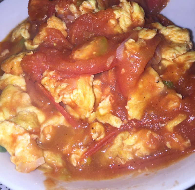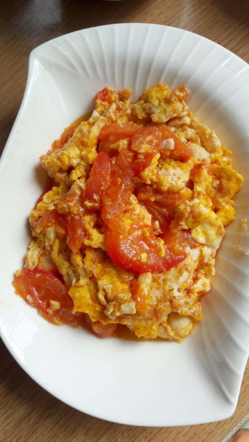 6:入煎好的鸡蛋,翻炒,让鸡蛋滚上番茄得汁