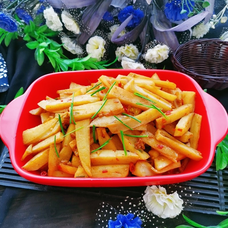 6:起锅烧油,油七成热时,下入藕条,翻炒均匀。