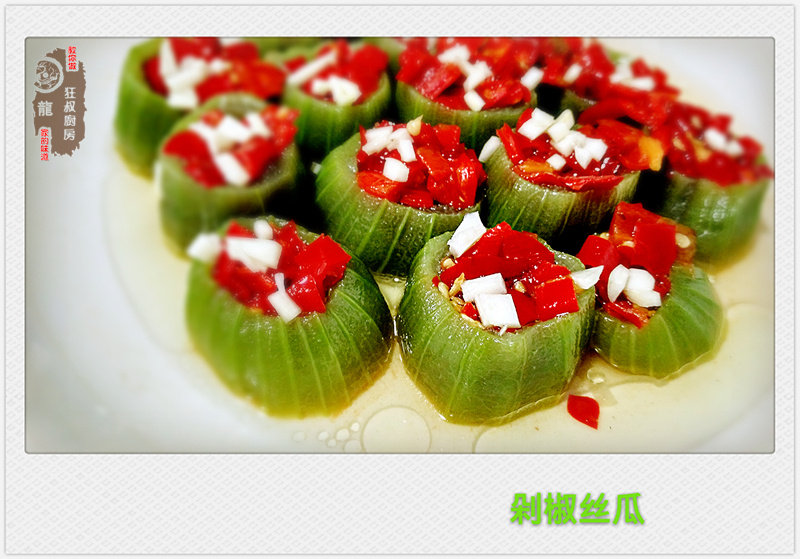 4:将丝瓜段放入盘里,在其上面放拌有味精的剁椒酱;