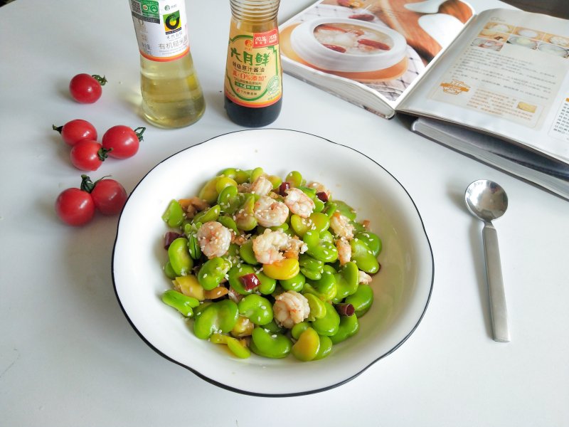 1:按照上述用量准备好各种食材:蚕豆去皮洗净沥干水分;虾仁泡发洗净沥水备用,调料备好。