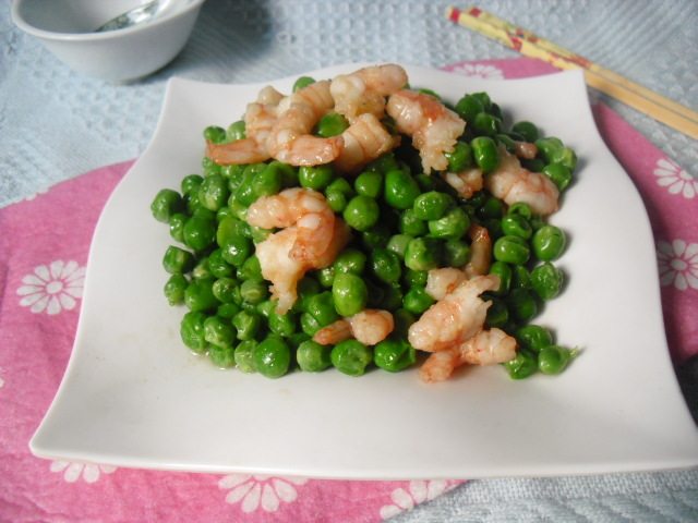 2:虾切2段,用料酒,生粉,胡椒盐拌匀入味.豌豆洗净.