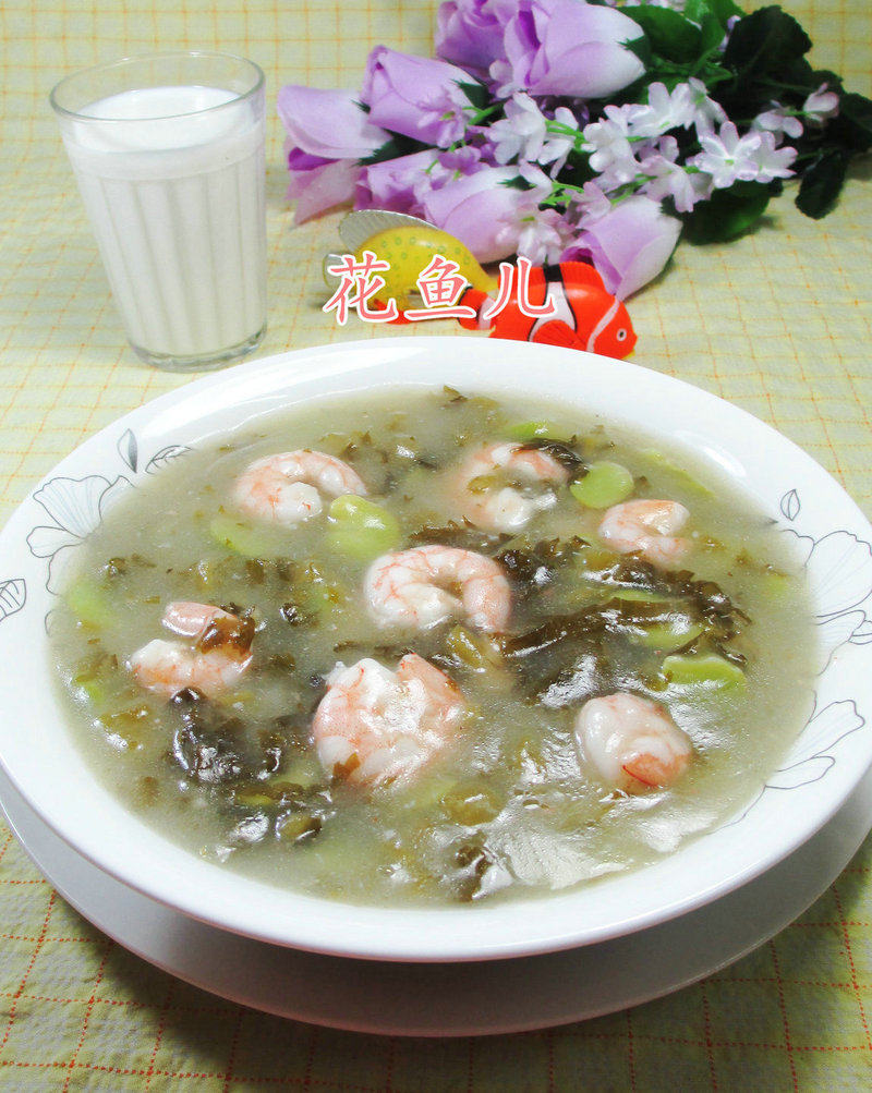 虾仁100克;雪菜80克;蚕豆肉115克;
