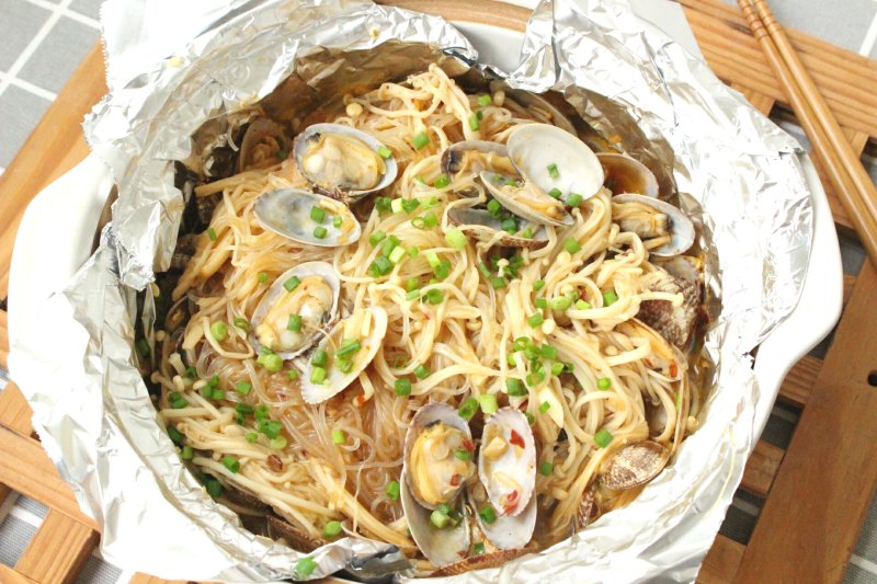 3:砂锅或者锡纸内铺上金针菇,泡软的粉丝,花甲,倒入炒好的蒜末,放入生抽、蒸鱼豉油、鸡精、味精、盐、豆瓣酱,开锅后小火炖10分钟。