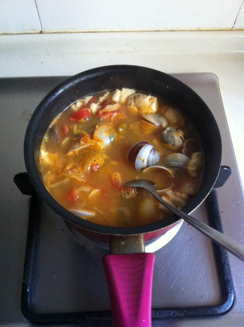 5:开锅后放入一汤匙韩式辣椒酱,搅匀