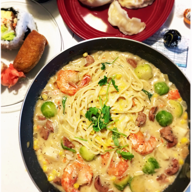 意大利面250克;虾7个;美式香肠200克;元贝3个;玫瑰卷心菜10个;蟹肉棒5条;