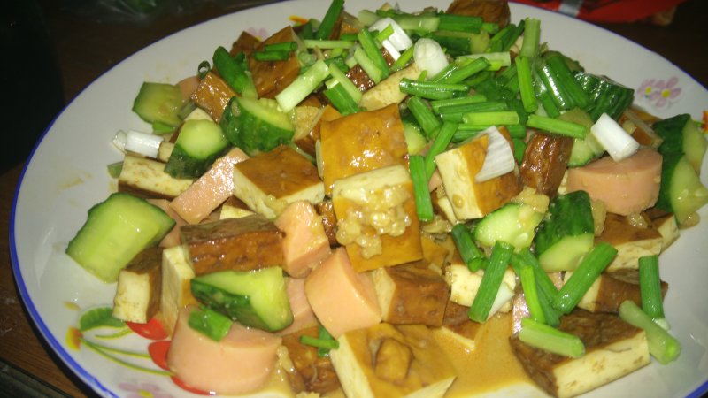 黄瓜1根;香干5块;香肠1根;香葱3根;