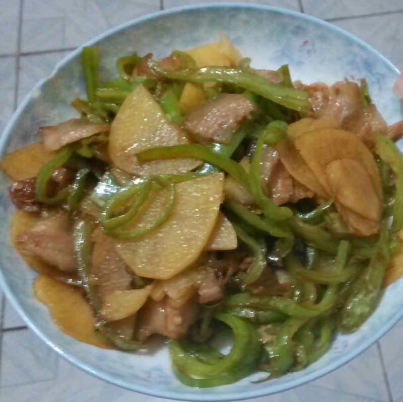 2:土豆切薄片,青红椒切小碎片,肉切片