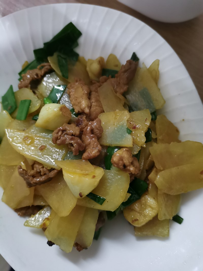 8:土豆丝熟后,倒入肉片,关火前加少许盐调味