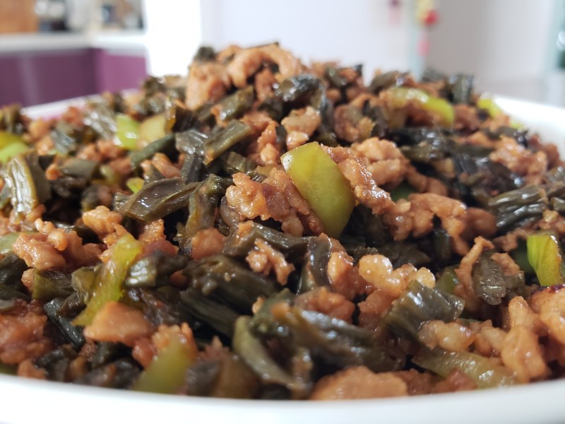 5:加入少许水,盖上锅盖中火收汁,等水份烧至少许时加入盐,鸡精调味。(因肉末已经提前腌过了,萝卜干虽浸泡过但还会有少许盐分,此次调味根据自己口味适量增加即可),翻炒均匀即可出锅装盘。