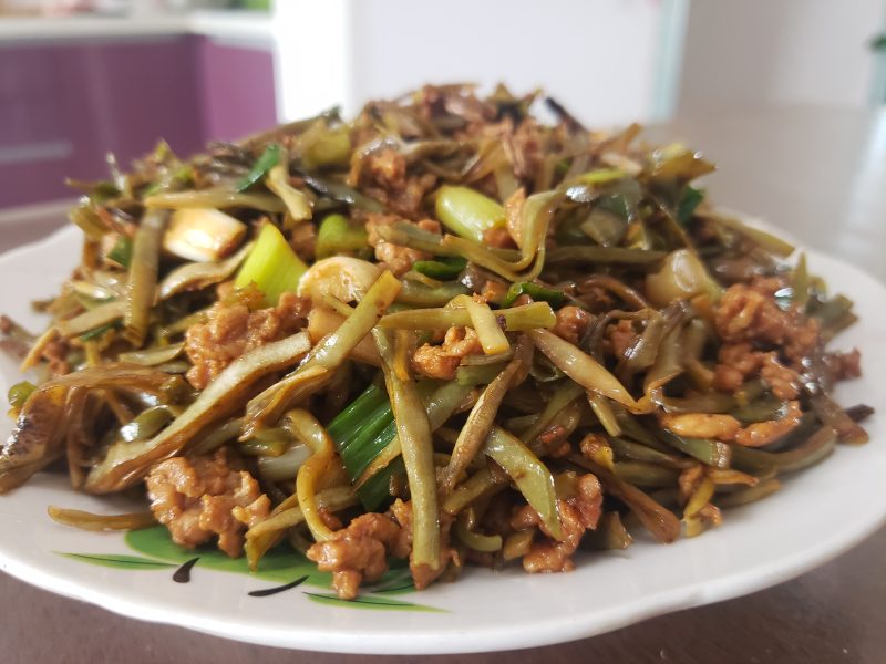 4:豇豆干入锅,加少许盐和白糖,煸炒,加适量水,闷一会儿,大火煸炒收汁。