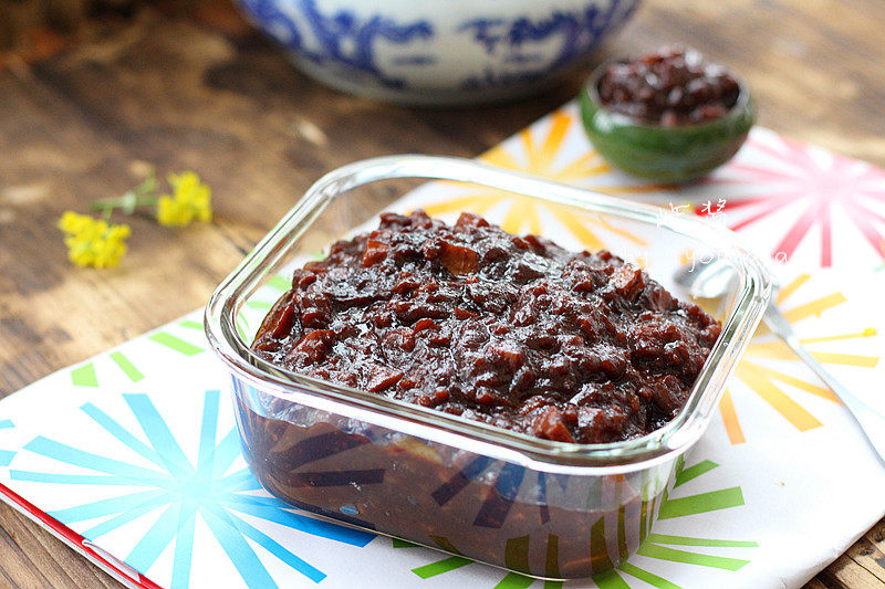 熬酱的时间长,酱的颜色越漂亮,中间要不停的翻炒,避免糊锅。加入豆干是吸收酱中的盐分。