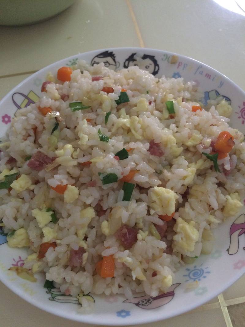 米饭1碗;胡萝卜适量;肘花肠适量;葱适量;