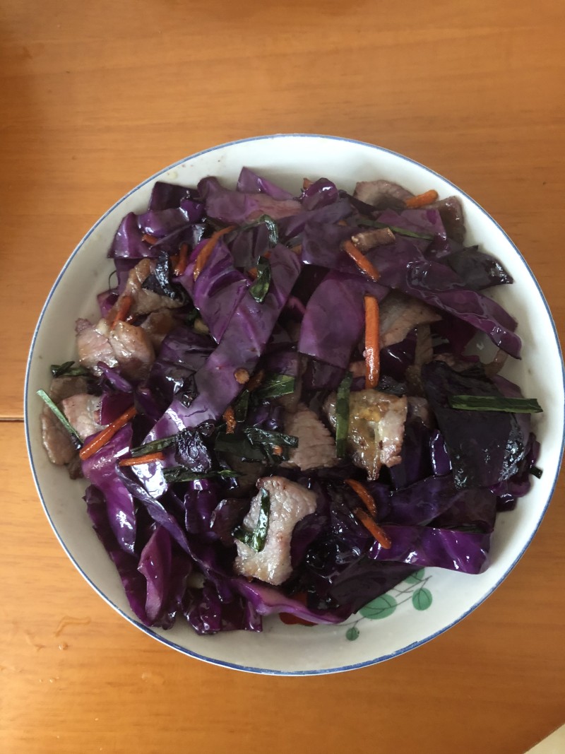 1:备料:腊肉切片,水洗。紫甘蓝想怎么切就怎么切。姜蒜与腊肉一起,胡萝卜纯粹附加的。同理,葱尾也是附加的。