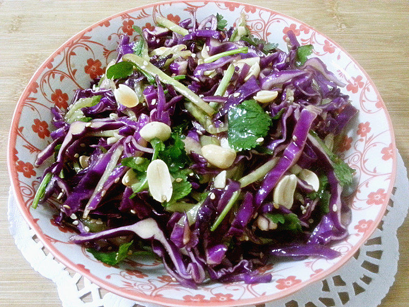 紫甘蓝1颗;黄瓜半根;香菜适量;
