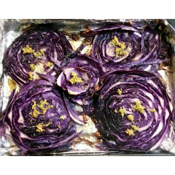 3:淋上橄榄油,撒上盐和黑胡椒,把两面都抹匀,外围的一圈也抹上一些。蒜末抹在紫甘蓝表面。上下火烤20-25分钟,到外围一圈焦黄,中心变软。