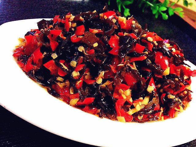 6:锅置火上,倒油烧制七成热时,加入黑木耳丝,红椒末以大火翻炒片刻