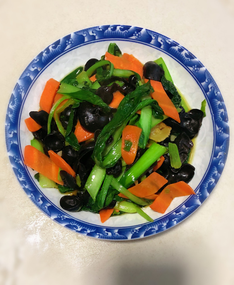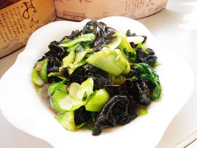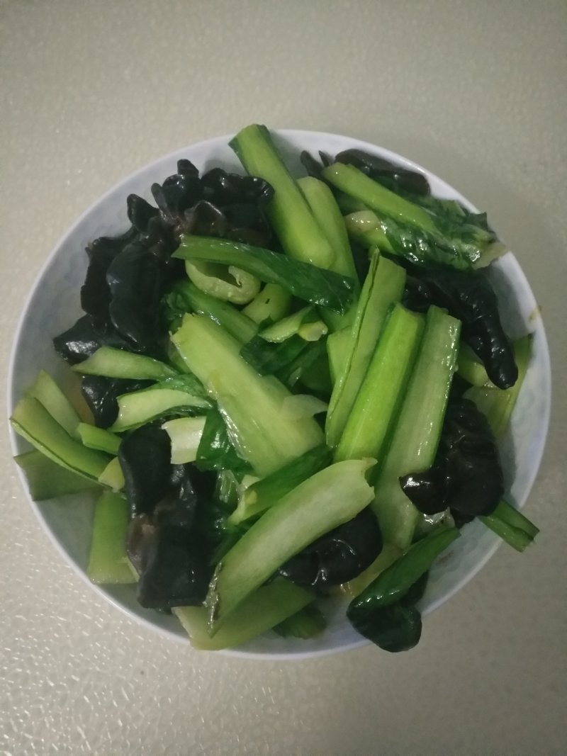 6:炒制到油菜塌秧、放入备用的黑木耳炒匀
