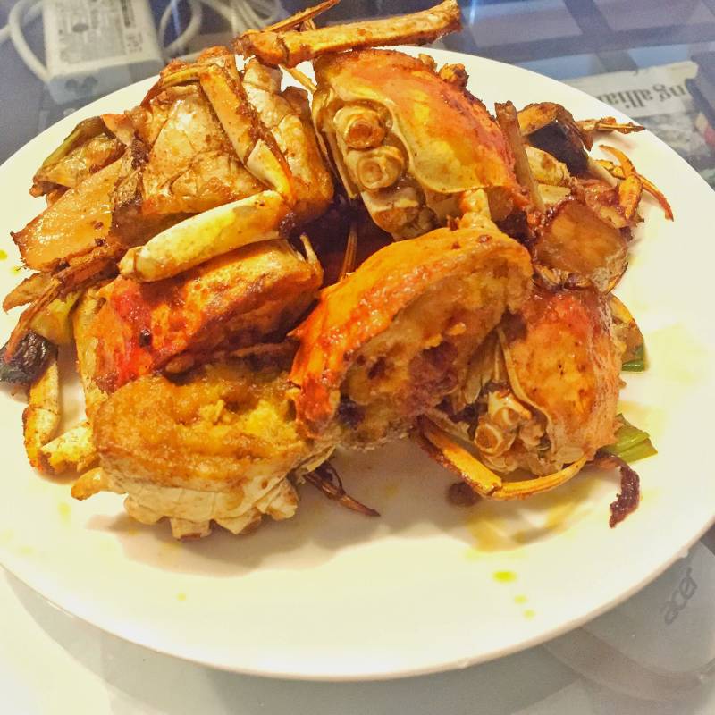 5:葱姜蒜爆锅,下螃蟹大火翻炒,依次放入料酒、糖、盐、生抽,翻炒三分钟出锅装盘。
