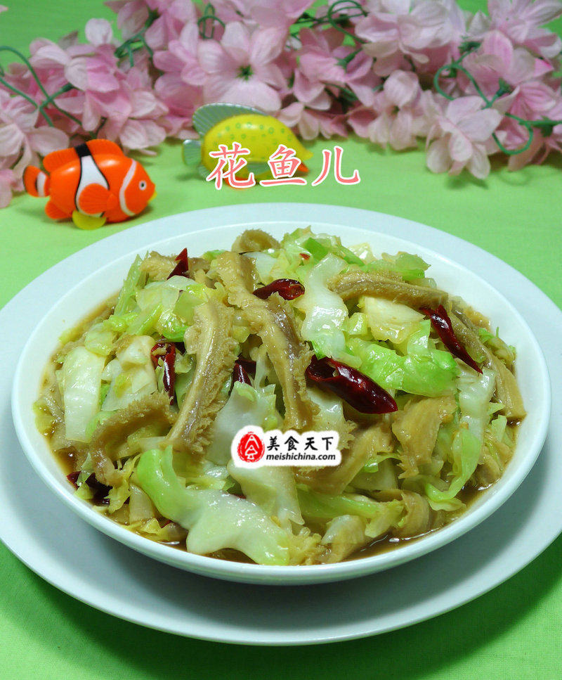 1:食材:圆白菜(已清洗切开)、熟牛肚(已切)、干辣椒(已剪开)