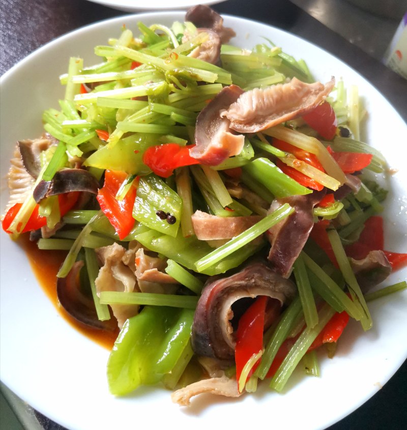 5:然后,合入切好的芹菜和熟猪肚翻炒一下。