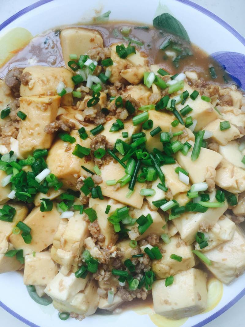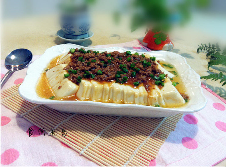 7:豆腐蒸好后、把倒流碗里的蒸汽水倒掉,然后把爆好的肉末均匀铺在上面,撒上葱花即可。
