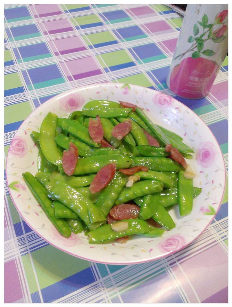 荷兰豆适量;广式香肠2根;