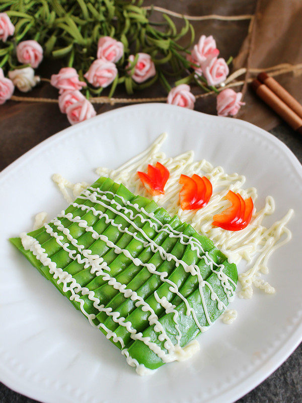 3:捞入冰水中冲凉,沥水后掐去头尾,摆盘,淋入沙拉酱即可食用。