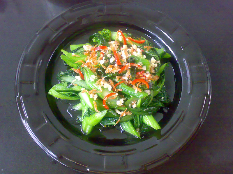 6:把爆好的香蒜虾米连油一起淋在盛好的菜心上,拌均匀即可食用