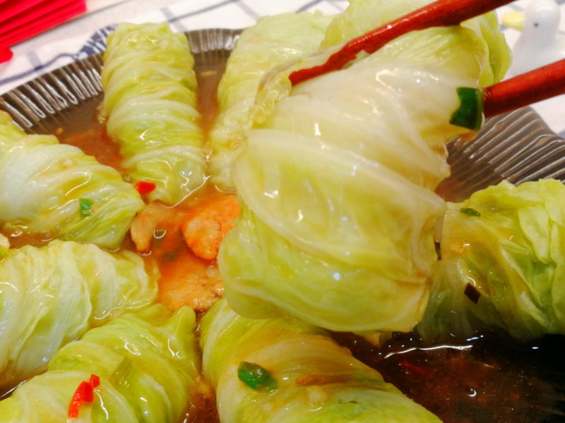 白菜焯的时间别太久,最佳时间是30秒,太烂的话影响口感和菜品颜值;烂了就不好包肉,焯好的白菜在铺的时候,白菜叶里面朝下,这样卷好的白菜外面更漂亮。