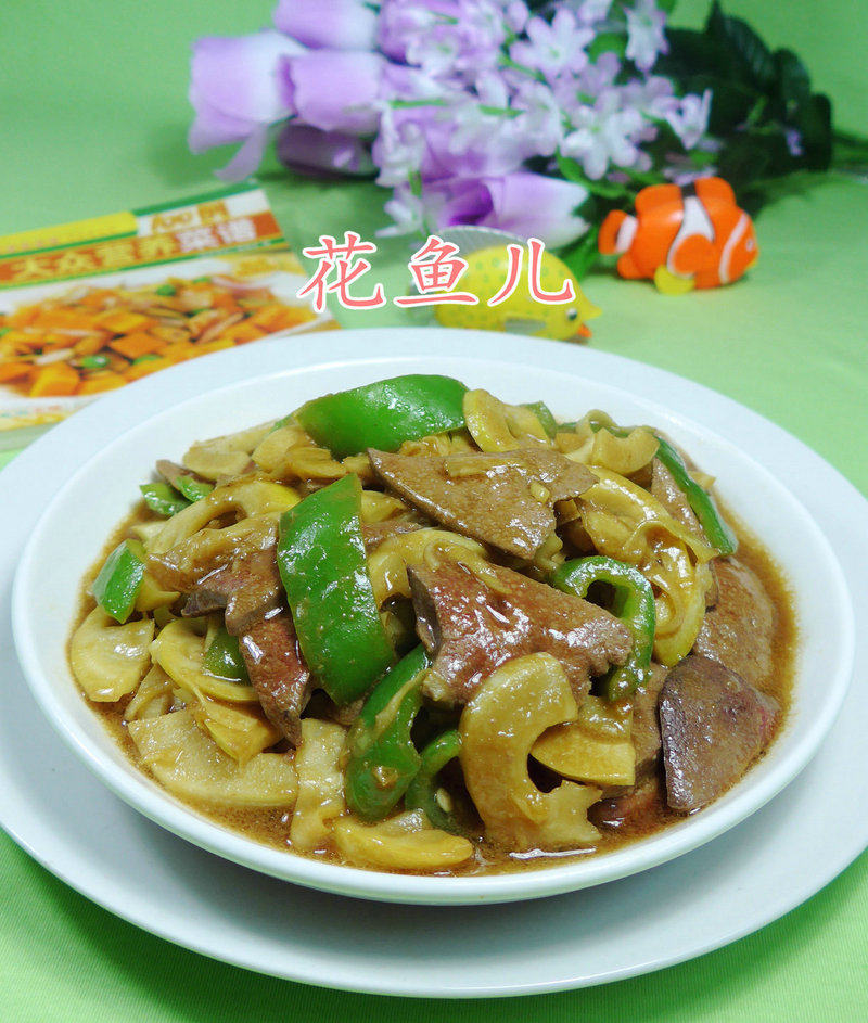 4:将锅洗净用葱葁炝锅,依次加入葫萝卜、青椒翻炒,再加入炒好的猪肝炒匀加盐调味即关火装盘。