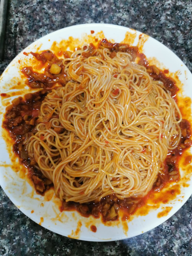 3:面条煮熟后,捞到酱汁里拌匀。完成!
