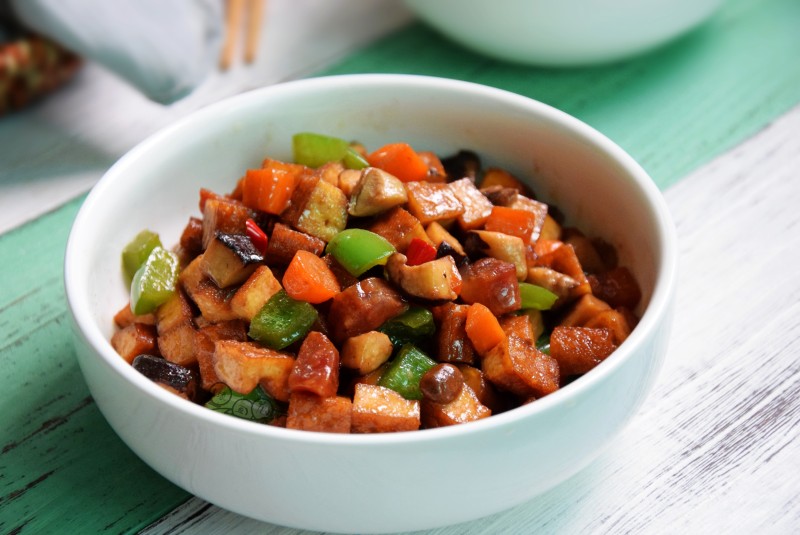 9:然后加入豆腐丁、胡萝卜、香菇以及青椒炒匀;