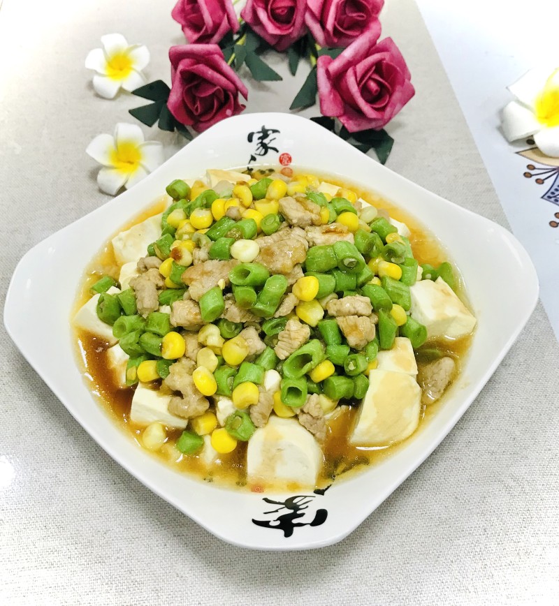 玉米半截;豇豆3条;肉末40g;豆腐1块;