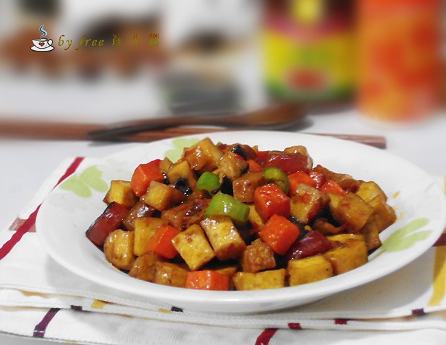 7:加入豆腐丁和胡萝卜一起炒,再调入生抽,加入黄豆酱,再加点盐调味炒匀。