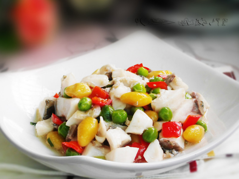 9:倒入鱼丁、白果、红椒、青豆,烧开后用水淀粉勾薄芡,加鸡精炒匀即可出锅。
