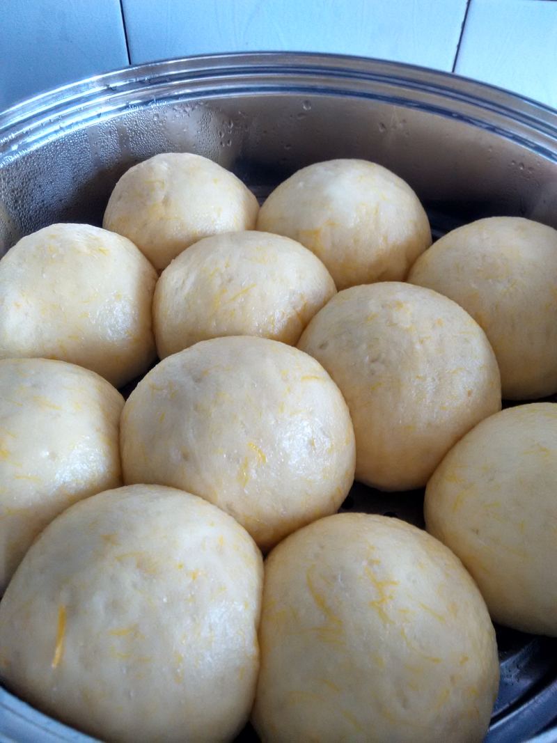 9:所有做好的南瓜馒头,间隔摆放在锅里,锅里提前加大量温水,二次发酵20分钟,感觉到南瓜馒头变胖就可以开火,大火上汽,转中火蒸20分钟。