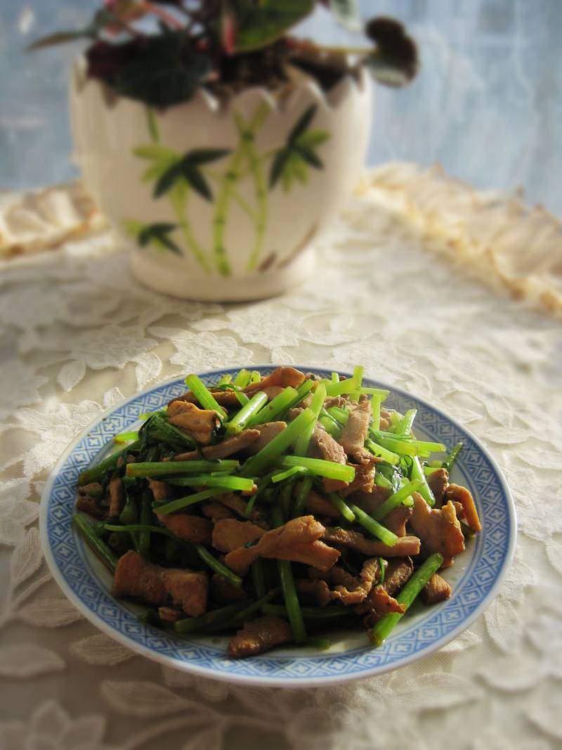 6:然后,合入切好的茼蒿翻炒翻炒。