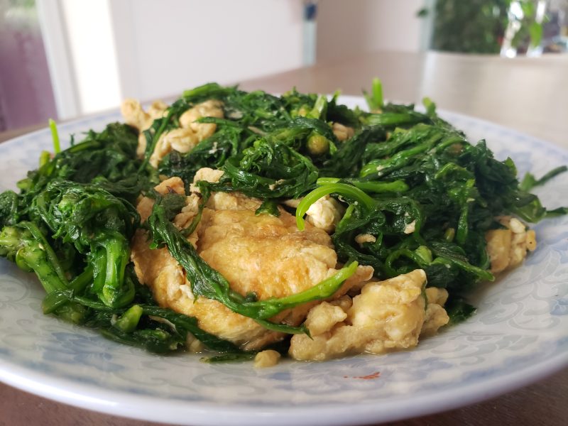10:烧锅倒油烧热,下入拌好的茼蒿蛋液。