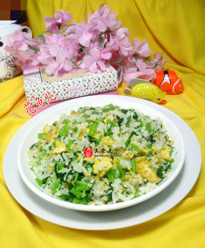 1:食材:茼蒿(已洗净切碎)、米饭、鸡蛋(已打入碗中)