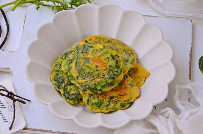 茼蒿的用量可以随自己喜好酌情调整,但不宜过多,以免难以成型。调料用量可以根据自己喜好酌情增减。煎烙时火不宜太大,以防焦糊。
