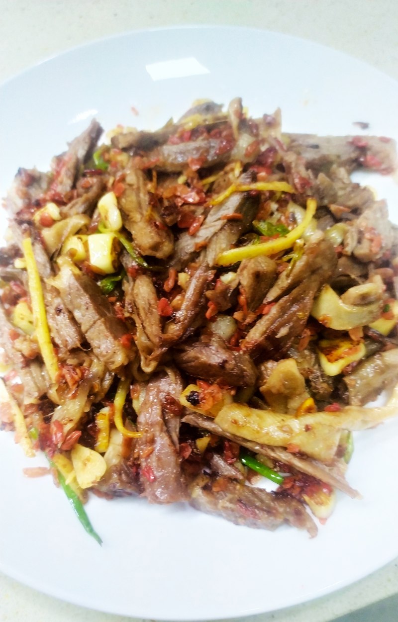 6:放煮好的牛肉煸炒出肉香。